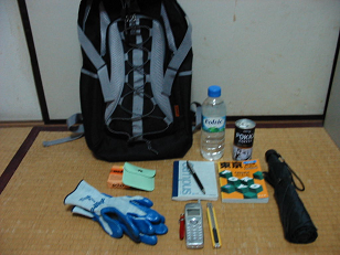 軍手(すぺリ止め付き)、カッター、地図、折りたたみ傘、タオル、Tシャツ、携帯電話、筆記用具、携帯灰皿、昼食など。
